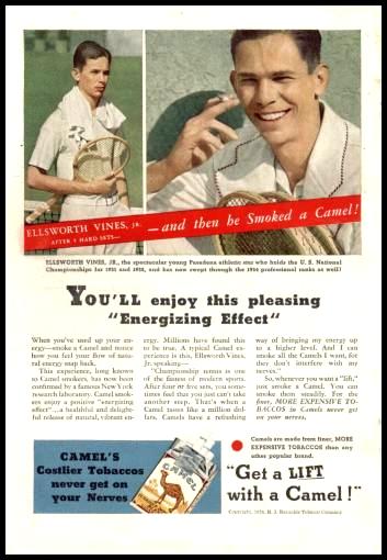 Certains l'appelaient Le Bombardier, mais il ne semble pas que ce surnom lui soit resté. Un qualificatif dévastateur pour celui qui passa comme un météore dans le monde du tennis. Ellsworth Vines est révélé en 1931 à 19 ans par sa victoire surprise à Forest Hills, champion du monde l'année suivante et pratiquement invaincu, inconstant et très critiqué en 1933, il ne supporte plus la pression que lui imposent ses dirigeants et passe professionnel à 22 ans ! Il était loin alors d'avoir atteint sa maturité et ce fut certainement une grosse perte pour le palmarès des tournois du grand chelem des années trente.