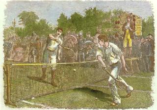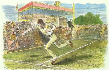 C'est en 1874 qu'un certain major Wingfield déposa son brevet pour « un nouveau et portatif court pour pratiquer l'ancien jeu de paume ». Le tennis était né. Il suffisait d'acheter la boîte du jeu, avec filet, poteaux, raquettes, et balles... et de disposer d'une pelouse unie et bien tondue! Le succès fut immédiat et considérable. Dès 1877 était organisée la première compétition de l'histoire du tennis, par l'« All England Croquet Club » rebaptisé depuis peu l'«All England Lawn Tennis and Croquet Club» ! Ce club existe toujours, il se trouve Worple Road, à Wimbledon, dans la banlieue de Londres... Il y eu 22 participants la première année, 34 la deuxième et 45 la troisième. Au simple messieurs vinrent s'ajouter les doubles en 1879 et le simple dames en 1884.