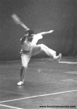 Le style inimitable de Borotra lors d'un match sur bois |