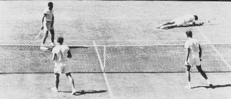 Sedgman-McGregor (de dos) contre Schroeder et Trabert (à terre) |