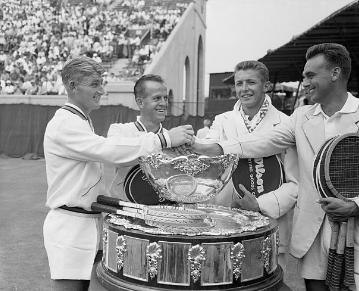 Hoad-Rosewal contre Trabert-Seixas. Victoire américaine 6-2 4-6 6-2 10-8. L'Australie a perdu la coupe Davis.