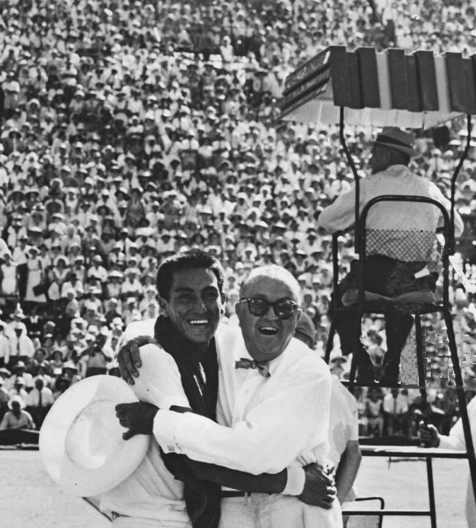 1958 : Perry Jones (cap) et Alex Olmédo après sa victoire sur Cooper