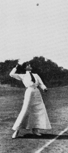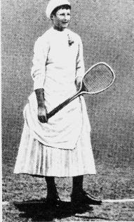 6 fois championne de Wimbledon entre 1886 et 1900. Chapeau, corset, jupe longue, cravate et gants blancs sont de rigueur |